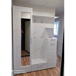 -слева шкаф платяной (штанга-выдвигающаяся), середина-ящик, справа-верх ящик +3 полки. Зеркало.