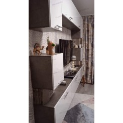 Модуль навесной горизонтальный (2 шт.): открытие вверх на газлифтах. Модуль навесной вертикальный (2 шт.): дверь распашная, 1 полка. Средние навесные модули: дверь распашная. Модуль навесной горизонтальный (3 шт.): дверь открывается вниз на барных кронштейнах