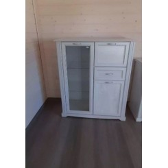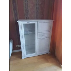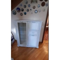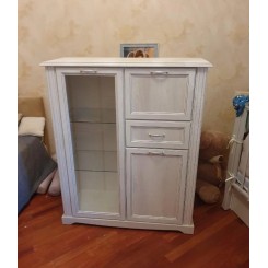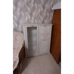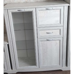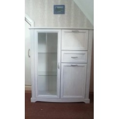 - характеристика: шкаф-комод, стеклодвери со стеклянными полками, выдвижной ящик на шариковых направляющих в центре. Дверца с одной полкой снизу.