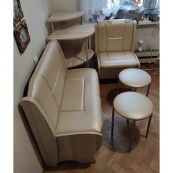 - комплектация уголка: скамья большая 950, скамья малая 550, стол, два табурета, этажерка угловая.